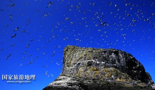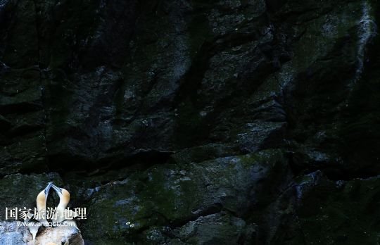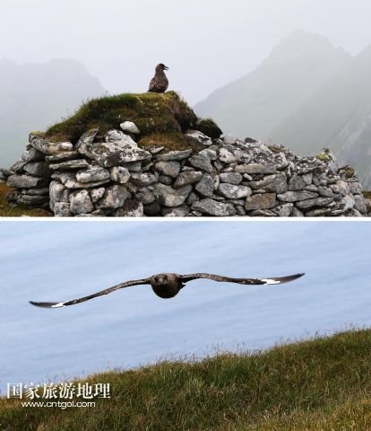 登上圣基爾達(dá)島并非易事,記者因風(fēng)高浪大在外赫布里底群島等待多日才有船出海。僅可乘載10余人的小船在風(fēng)浪中穿行了近3個(gè)小時(shí),圣基爾達(dá)島終于出現(xiàn)在霧色籠罩的海面上。島上散落著十余座已經(jīng)荒蕪破敗的石舍和幾百個(gè)儲(chǔ)物石室,這些殘存的遺跡早已成為野羊與海鳥的巢穴,人類反而成為外來的訪客。人類文明的消失為一些稀有的物種和瀕臨滅絕的鳥類提供了安全的棲息地。島上陡峭的山坡隨處可見野羊悠然漫步,而那些嶙峋的峭壁和海礁則棲息著數(shù)十萬只各類海鳥。世界上最大的塘鵝群——約6萬對(duì)塘鵝在這座海島及附近的海礁上繁衍生息。