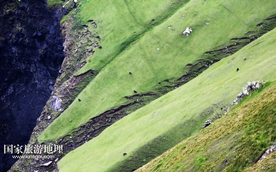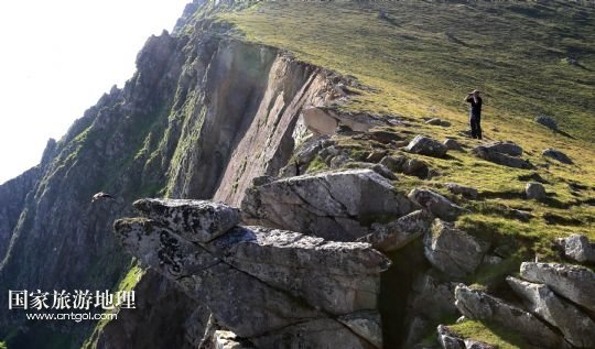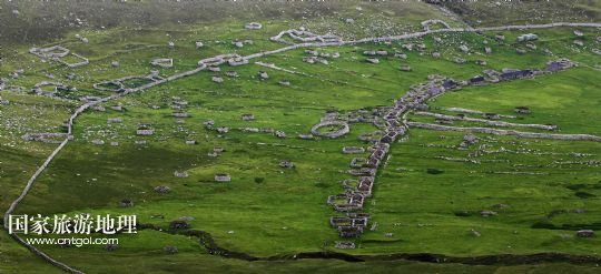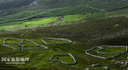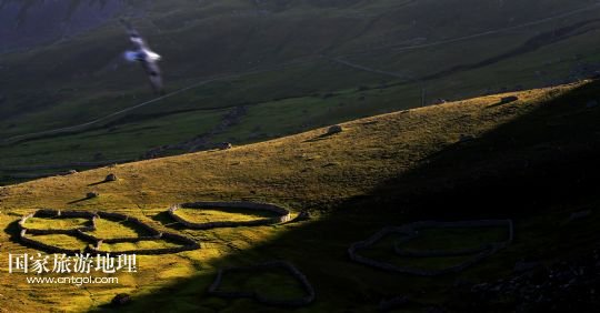 國家旅游地理 英國倫敦8月14日訊 在圣基爾達(dá)島已經(jīng)遺棄的村落旁的山坡上,有用石頭圍墻圈起的一塊塊耕地。當(dāng)年在島上定居的村民在這些石圈內(nèi)鋪墊海藻,種植少量谷物。一個(gè)個(gè)形狀各異的石圈保護(hù)著這些寶貴的谷物免遭風(fēng)暴與家畜的侵害(7月19日攝)。