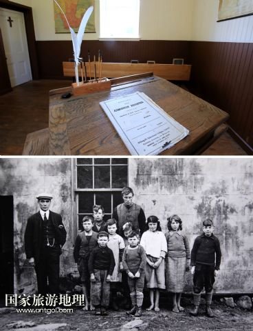 上圖,圣基爾達(dá)島上只有一個(gè)教室,一排課桌的小學(xué)校內(nèi)景(7月19日攝)。學(xué)校后來經(jīng)過重新整修。下圖,當(dāng)年島上學(xué)校師生的合影(資料照片,蘇格蘭國家信托基金會(huì)提供)。
