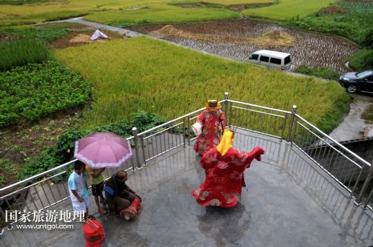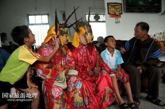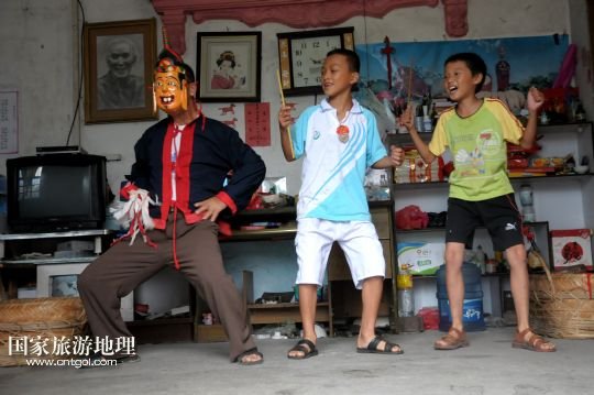 國家旅游地理 廣西河池8月19日訊 8月18日,譚圣慈老人(左一)帶著前來學習的兩名男孩跳儺面舞。在廣西北部與貴州交界一帶的我國唯一的毛南族自治縣——環(huán)江毛南族自治縣,神秘的儺戲被譽為毛南族的“族寶”。原始古樸、風格獨特的儺戲是毛南族的民間傳統(tǒng)舞蹈,藝人在表演過程中經(jīng)常戴著被稱為儺面的木制面具。儺面一般高30厘米、寬20厘米,由毛南族藝人在民族口頭文學的基礎上依據(jù)個人想象創(chuàng)作,用優(yōu)質木塊雕琢而成,共有文、武、善、兇四大類72種面相。