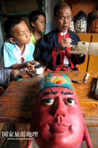 譚圣慈老人今年72歲,從22歲開始學雕刻儺戲面具,迄今,已經(jīng)堅持了50年。老人說,他制作的面具因工藝精湛,造型優(yōu)美,曾吸引遠方的客人高價購買。但是,卻少有人來學習面具的雕刻與制作。儺戲于2006年被列入非物質文化遺產(chǎn)名錄之后,政府加大了保護力度,但因為面具的制作周期長、工序復雜,銷售渠道少等原因,仍無法吸引年輕人學習雕刻的興趣。為了收到心儀的徒弟,傳承這獨到的技藝,他到處發(fā)布免費收學徒的信息。在他的堅持下,今年暑期,鄉(xiāng)里有兩名對面具制作感興趣的男孩來到譚圣慈身邊學藝。老人高興地說:“我給他們講很多故事,就是希望他們能對此提起興趣,愛上木面雕刻,別讓這老手藝失傳了。” /新華社發(fā)