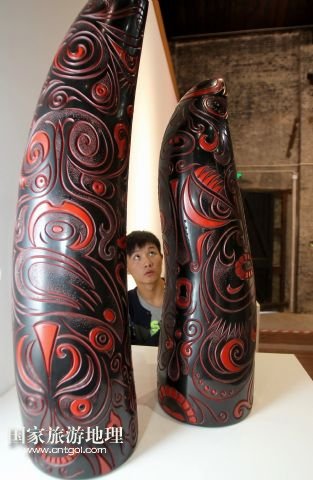 9月6日,一名參觀者在中國(guó)當(dāng)代漆藝展上欣賞由大漆、布脫胎制作的作品《圖騰柱》。