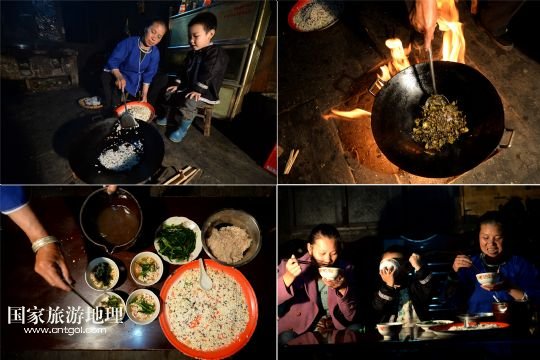 5月14日晚飯過(guò)后,高友村民在家里制作、品嘗當(dāng)?shù)貍鹘y(tǒng)美食糯米韭菜油茶(拼版照片)。