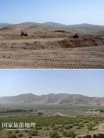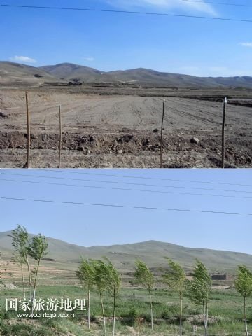 國家旅游地理 寧夏中衛(wèi)6月9日訊 上圖上:2014年5月的資料照片上甘鹽池一片荒涼;上圖下:6月4日,記者拍攝的甘鹽池已是綠意盎然(拼版照片)。寧夏海原縣甘鹽池地處黃土高原干旱帶上,平均海拔約2100米,年均降雨量在280毫米左右,自然災(zāi)害頻繁,十年九旱。2014年以前,這片近12萬畝的土地可謂一片荒蕪。2014年,海原縣甘鹽池管委會通過確立“盆地改良、種草養(yǎng)羊、綠化美化、提升人氣”的工作思路,對2.2萬畝砂石地和山坡地進(jìn)行改良和治理,如今甘鹽池滿滿的綠意讓人為之一振。 新華社記者 李然 攝