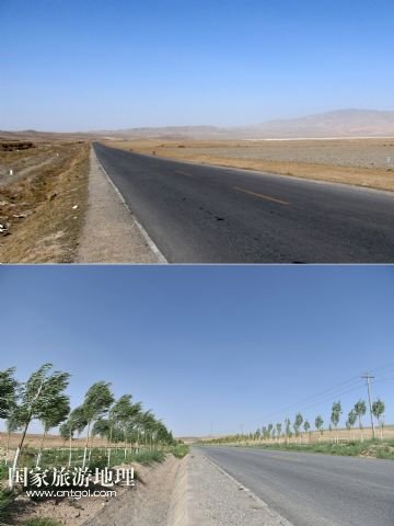 上圖上:2014年3月的資料照片上甘鹽池一片荒涼;上圖下:6月4日,記者拍攝的甘鹽池已是綠意盎然(拼版照片)。