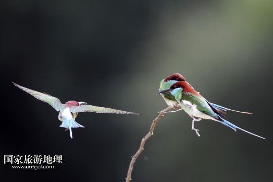 國(guó)家旅游地理 江西九江6月14日訊 6月14日,藍(lán)喉蜂虎在鄱陽(yáng)湖畔的樹枝上休憩。進(jìn)入夏季以來(lái),位于我國(guó)第一大淡水湖江西鄱陽(yáng)湖畔的九江市廬山區(qū)姑塘鎮(zhèn)迎來(lái)了眾多美麗的小鳥藍(lán)喉蜂虎。
