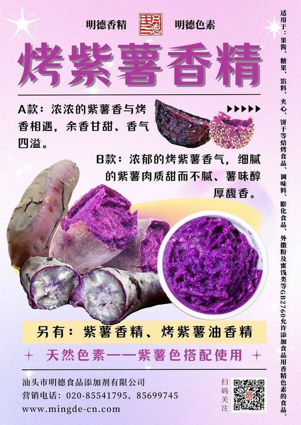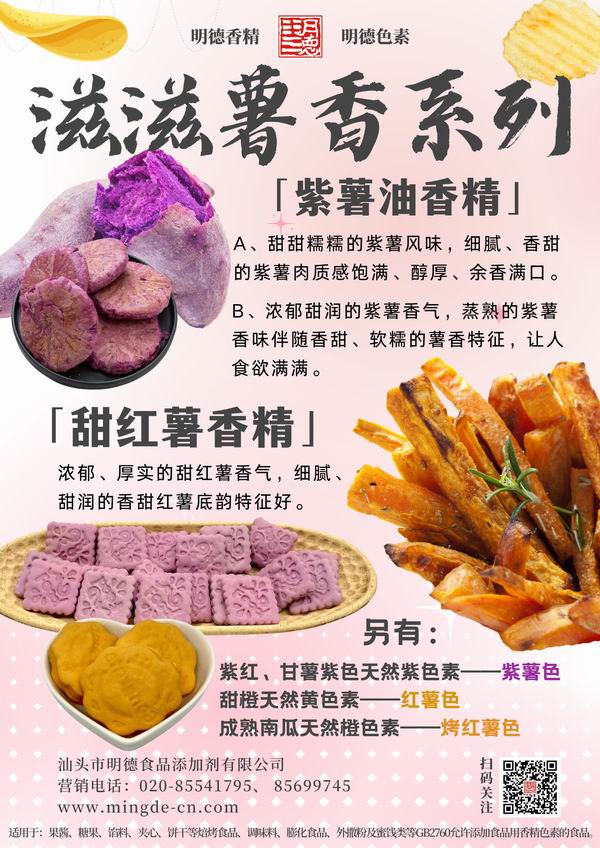 在薯味香精領(lǐng)域我們數(shù)十年潛心專(zhuān)研,迎合市場(chǎng)需求,滿足消費(fèi)者喜好,汕頭市明德食品添加劑有限公司,推出了多種風(fēng)味的薯香風(fēng)味香精,如:紫薯香精、紅薯香精、烤紫薯香精、烤紅薯香精、甜紅薯香精等。